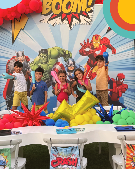 استعدوا للإثارة مع حفلة الأبطال الخارقين! زاخرة بالألوان الجريئة والألعاب الشيّقة والمرح البطولي، حيث يمكن للأطفال أن يتقمصوا شخصية بطلهم المفضل ليوم لا يُنسى من المغامرة والاحتفال.