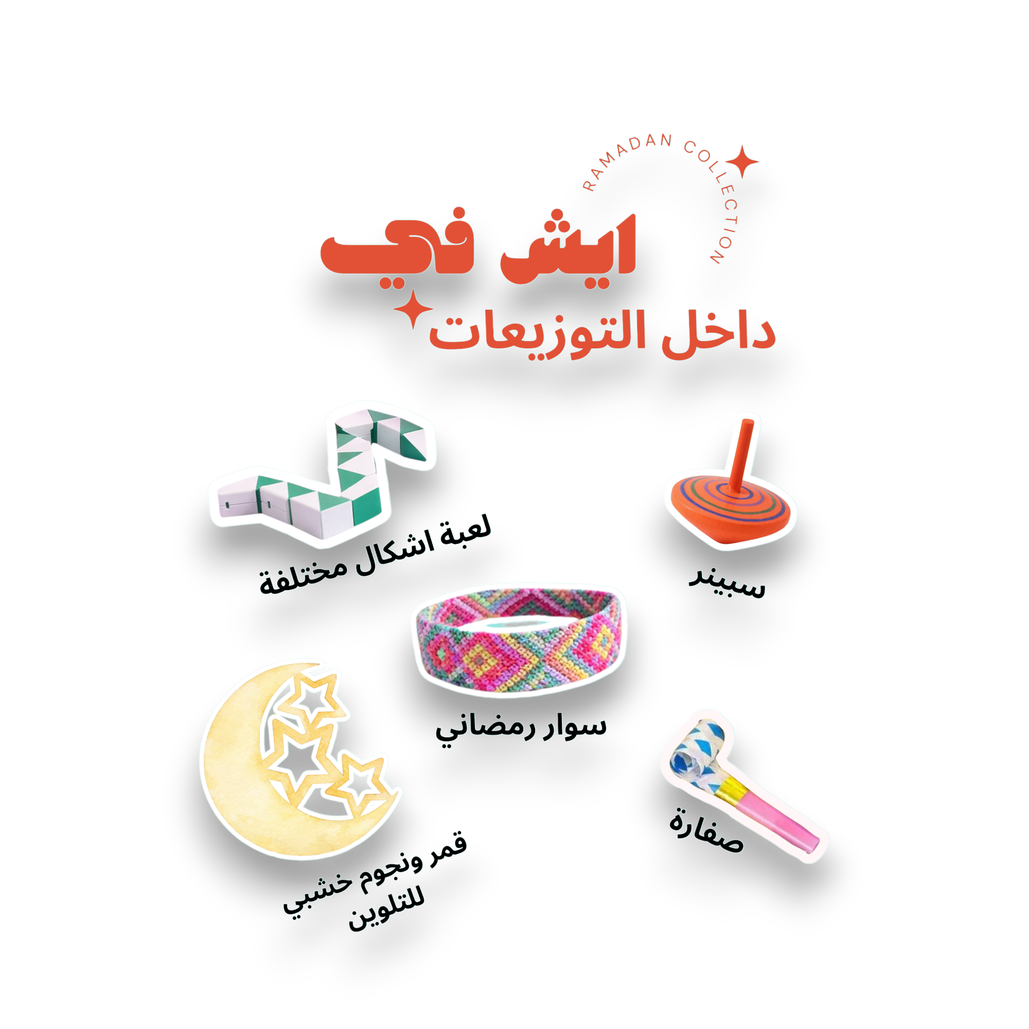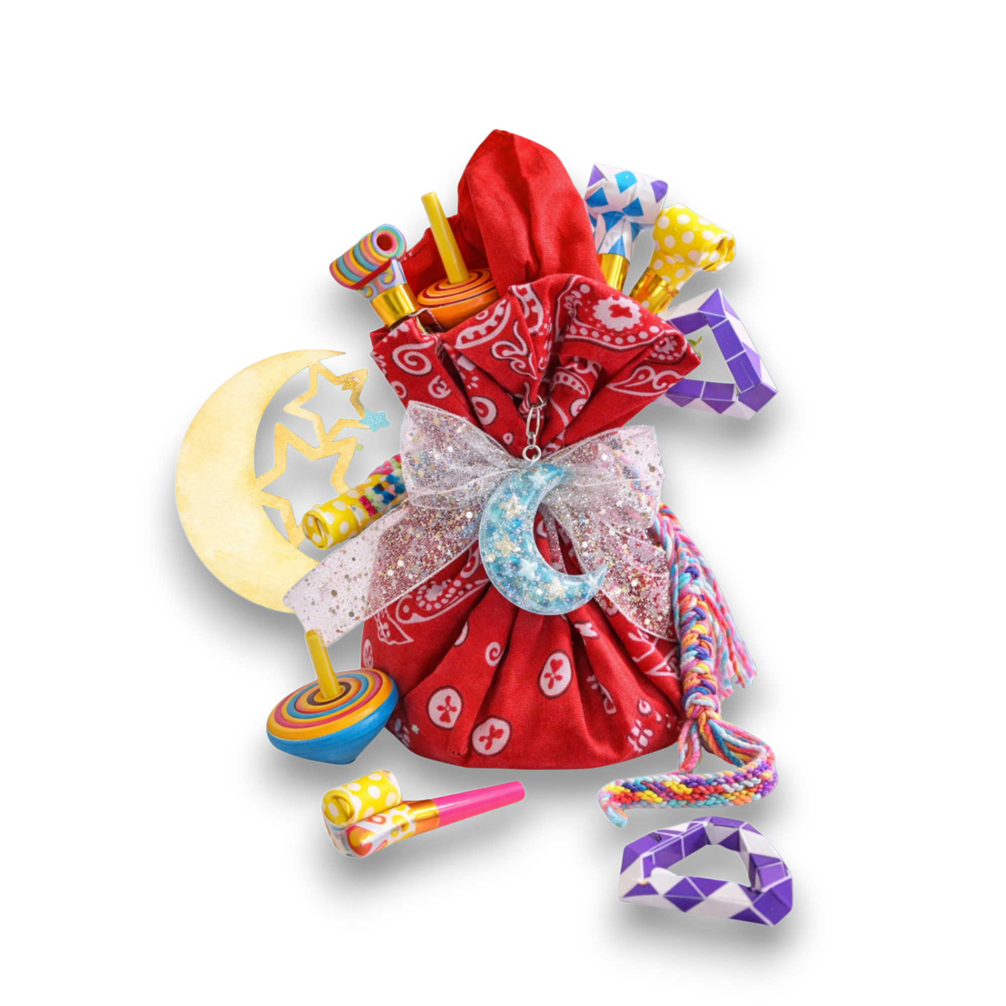 هلال خشبي - سوار - سبينر + لعبة تشكيل بلاستيكية - صافرة حفلات