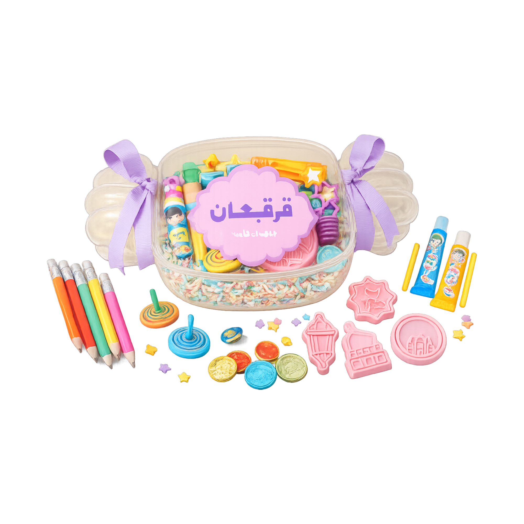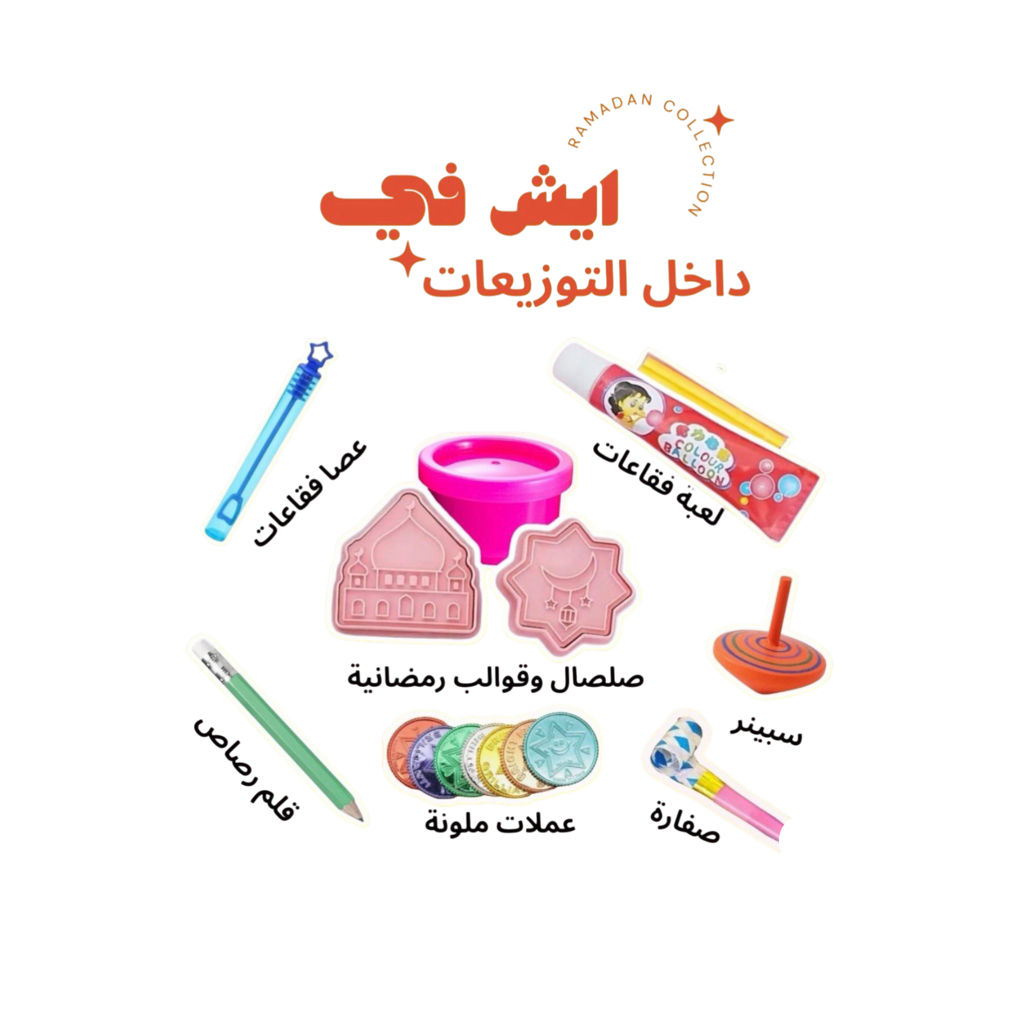 A bubble stick - A bubble straw toy - Spinner - playdough + 1 Ramadan themed cutter - colorful shiny coins - colorful pencil - party whistle